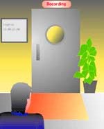 おっかなびっくりスタジオの建物に入ると、ロビーには誰の姿も見えず静かでした。約束の時間に近くなって、突然スタジオに通じる大きな扉がゴトンと開きました。