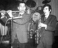 1年後、19才の時の写真。左の不自然な人はドラムの今泉さん。(バディ・リッチが好きだったのか、ばでぃと呼ばれていた。)いい加減なところもあって周りからはバッシングが多かったけども、無類のお人好しで、私は大好きな人だった。夢を見るような顔で「こうしたら楽しいよナ。ああだったら面白いよナ」。音楽の話を始めると朝まで続いた。生意気盛りの私をフォローしてよく面倒も見てくれた。ある日、かなり年上のサックス奏者とあわや喧嘩というとき、「止めろ、止めろヨ」と相手を羽交い締めにして肩越しに目配せする。何やら口が動いているので、よく見ると「殴れ、殴れ。早くっ、、。」だった。