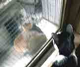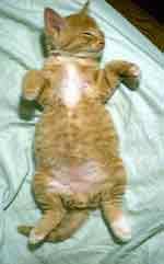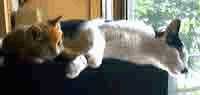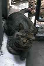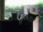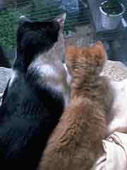 パスタとの生活が1年以上経った2002年の6月25日、サッカーのドイツ/韓国戦が始まって間もなく、玄関の方から「ミーッ、、ニョーッ」という声が聞えるので外に出ると、2匹の子猫がドアの前にいました。一匹はウチの中に入ろうとしました。掴み上げると「フーッ」と一人前に噴き、下に戻すとヨタヨタしながら逃げました。