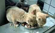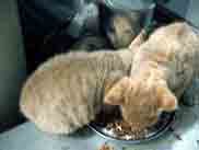 5匹もいると、必ずはじき飛ばされてべそをかく者がいます。可哀想なので、家の中に招待して食べ物を与えてみました。懸命に食べてはいますが、実はとても緊張しています。「うー」とか唸っていましたが「とりあえず食べるのが先!」という事なんでしょう。下の猫は後日ウチに来ることになった「みかん」ではないかと思われます。この様子を見ていた母猫が「この人に」と決断したのかもしれません。