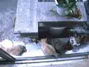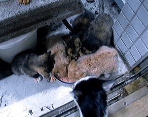 明けて26日正午、何時もお見えになる猫(モンク)がやって来ました。彼が一通り食べて満足したころ、なんと昨夜の子猫達が次々に現れ、母猫も顔を見せました。モンクの家族だったのかもしれません。下の写真はその時の様子です。ボロいデジカメですが、夜のものより幾分マシかと思います。親はカメラを向けると逃げますから撮れませんでした。
