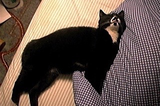 それで翌朝、起きた時には猫の存在を忘れていて、起き抜けの寝ぼけ眼で、ベッド後方から心配そうにこちらを覗き込むねこの姿にビックリして「あれっ、おまえ帰らなかったのか」と声を掛けました。