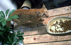 午前中、催促するでもないのですが、自発的に食事を与えるオヤジを「待ってました!!」と言わんばかりに元気よく迎える子猫達。(一回り大きくなりました)上に見える植木は、虫食いでボロボロになったが辛うじて生きている「くちなし」。毎朝、倒れ転がっていて、置き直すのが日課でした。
