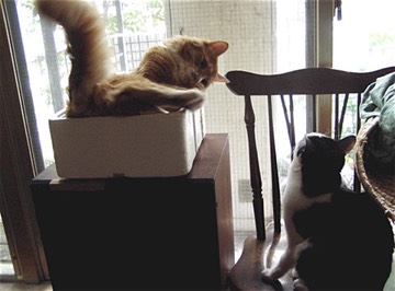 この日、チビは部屋に侵入。ウチの2名を威嚇したりしつつ遊んでお帰りになりました。遠巻きにしつつも興味津々のパスタとみかん。 終始、野良の勢いに圧倒されていました。