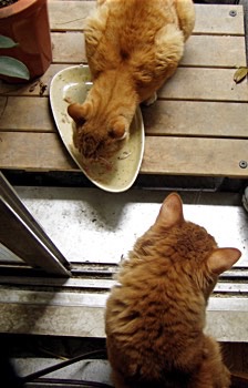 母猫は以前ほど頻繁ではなくなりましたが、たまに思いきり甘えた声を出して現れます。最近は抱き上げても大丈夫なぐらい馴れました。久々の母子対面、母は食事に忙しく息子のことなどお構いなし。息子は息子で「この伯母さん知っているような気がするのは何故?」という風に見えます。