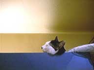 あちこちの物をひっくり返したりした揚げ句、この段ボール箱がお気に入りに。猫が高い場所を好むようで、この場所からだと部屋の隅々まで目が届くし、とうちゃんがどこにいるかすぐに分かるってことらしいのです。