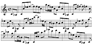 このアルバムの中のファンク・チューン「 Listen Here」もミリオンヒットとなり、トップ10を記録しました。Eddieは「ダンスの為のラテンジャズ」と説明しています。上の譜面のベースラインが繰り返されるだけの曲です。メロディは(譜面は導入部)シンプルです。ブルース・フィーリング溢れるソロは(記譜はBb)、下のように低音と高音を駆使してエキサイティングに繰り広げられます。